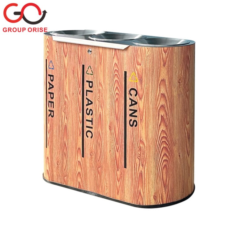 H022-HW109-3 | Wooden Finish Multi-Compartment Recycling Bin – Paper, Plastic, Cans