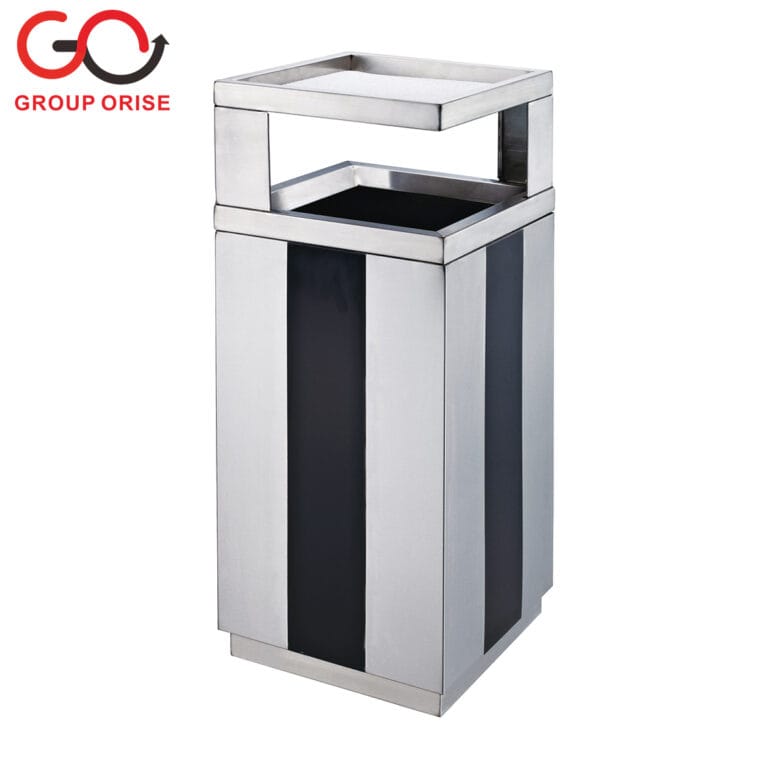 H022-B013 | Indoor Waste Bin – Brushed Steel Body with Black Vertical Panels and Front Slot